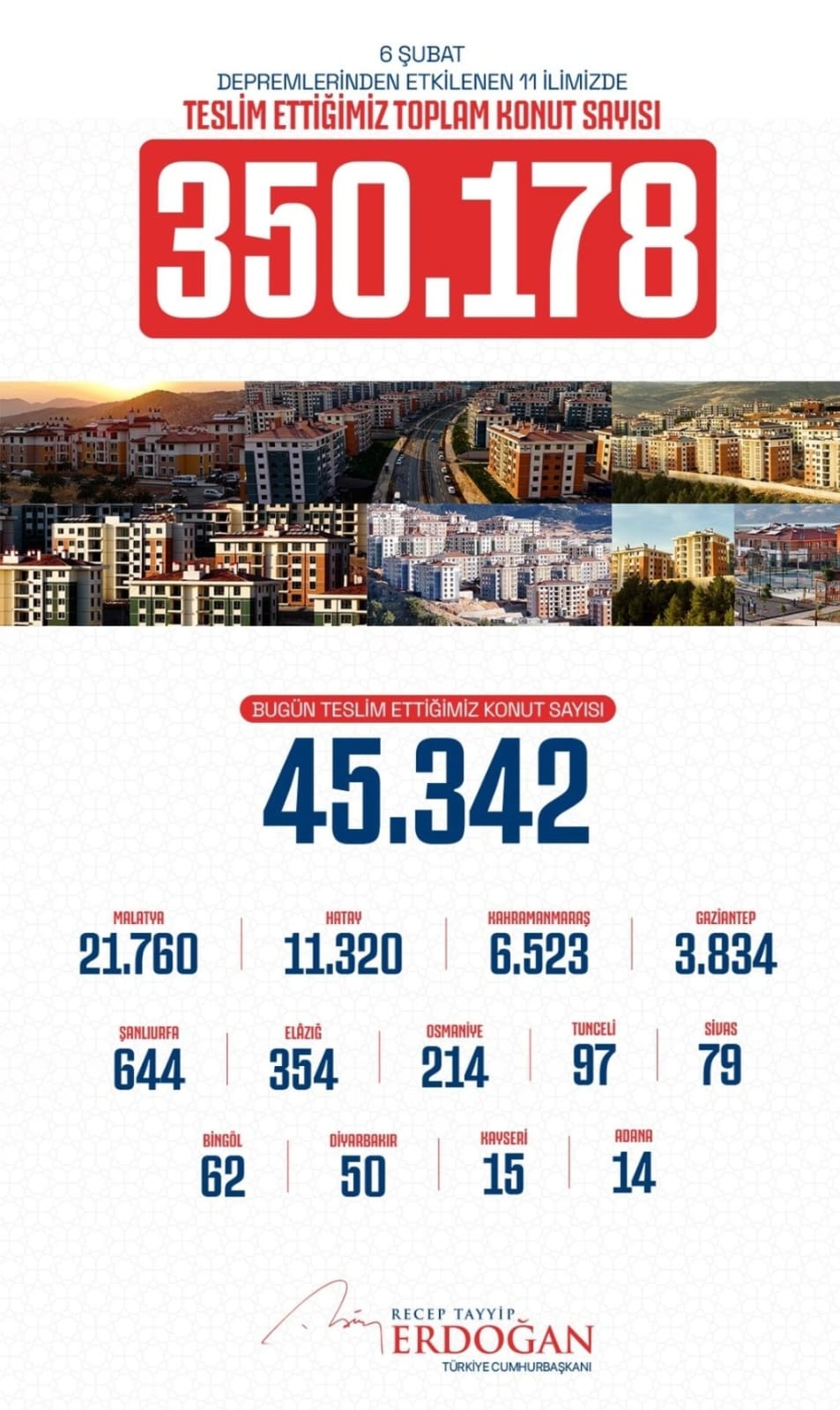 6 Şubat 2023 tarihinde meydana gelen Asrın felaketi olarak adlandırılan depremler sebebiyle yıkılan on binlerce bina ve kaybettiğimiz 50 binden fazla insanımızın ardından Türkiye tüm imkanlarıyla deprem yaralarını sarmak için seferber oldu. Bu kapsamda devlet eliyle yürütülen çalışmalar söz konusu konutların yapımı için de seferber edildi. Cumhurbaşkanı Recep Tayyip Erdoğan söz konusu deprem sebebiyle inşa edilen konutlardan 350 bininci konutun teslim edildiği törenin düzenlendiği Adıyaman'da sayısal verileri açıkladı.