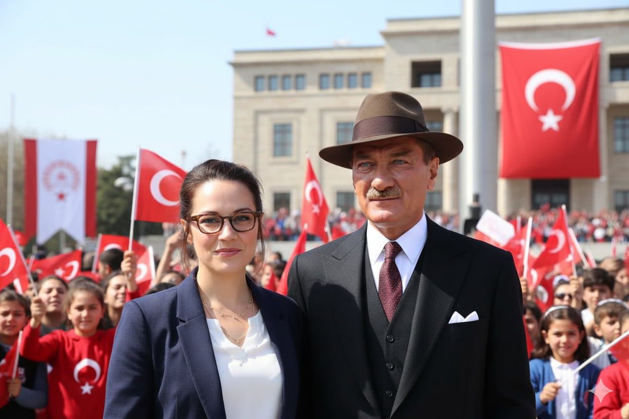 4- Talebimizi sorgu alanına yazıyoruz Bu resimdeki öğretmeni Atatürk ile yan yana Cumhuriyet Bayramı kutlamalarında yan yana olacak şekilde oluştur. Ardından Gemini bize aşağıdaki resim tarzında bir resim oluşturacak