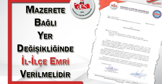 Anadolu Eğitim Sendikası olarak Milli Eğitim Bakanlığına başvurarak “2020 Yaz Tatili Mazerete Bağlı Yer Değişikliği” döneminde mazerete bağlı yer değişikliği yapılamayan öğretmenler için il-ilçe emri verilmesini talep ettik.